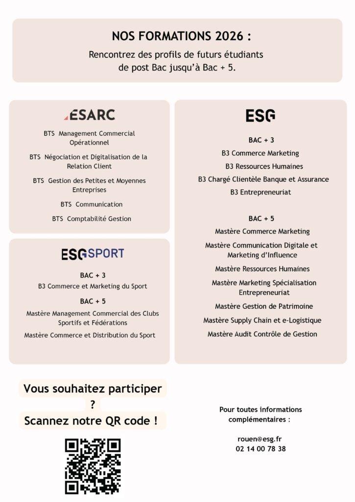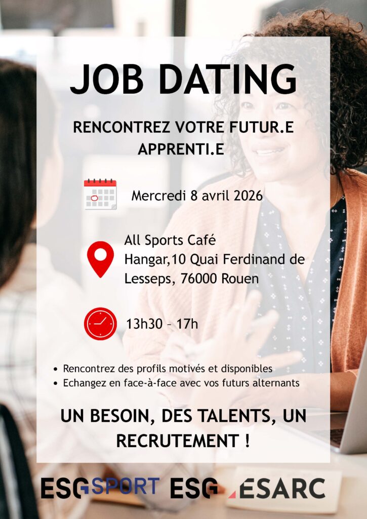 Dans le cadre de leur accompagnement d’alternance 2026-2027, l’ESG Rouen a le plaisir de vous convier à notre prochain Job Dating dédié à l’alternance.