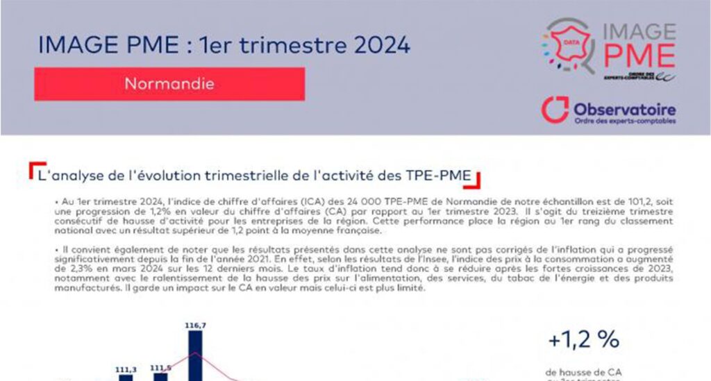 • Au 1er trimestre 2024, l’indice de chiffre d’affaires (ICA) des 24 000 TPE-PME de Normandie de notre échantillon est de 101,2, soit