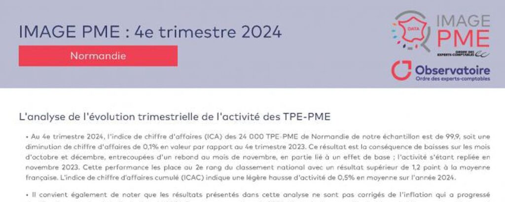 • Au 4e trimestre 2024, l’indice de chiffre d’affaires (ICA) des 24 000 TPE-PME de Normandie de notre échantillon est de 99,9, soit une diminution de chiffre d’affaires de 0,1% en valeur par rapport au 4e trimestre 2023. Ce résultat est la conséquence de baisses sur les mois d’octobre et décembre, entrecoupées d’un rebond au mois de novembre, en partie lié à un effet de base ; l’activité s’étant repliée en novembre 2023. Cette performance les place au 2e rang du classement national avec un résultat supérieur de 1,2 point à la moyenne française. L’indice de chiffre d’affaires cumulé (ICAC) indique une légère hausse d’activité de 0,5% en moyenne sur l’année 2024.